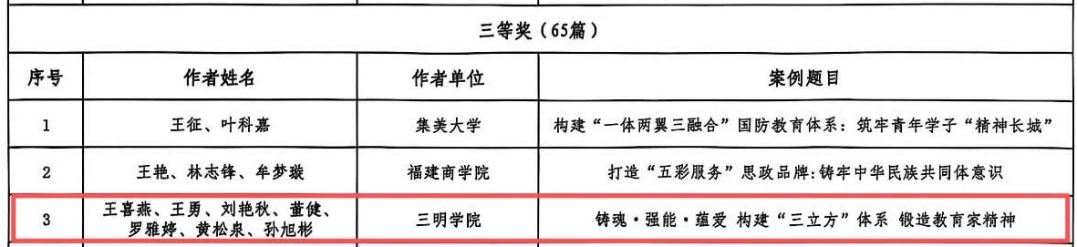 近日,福建省高等学校思想政治教育研究会公布了2025年优秀工作案例评选结果,体育与康养学院报送的《铸魂·强能·蕴爱 构建“三立方”体系 锻造教育家精神》案例成功摘得三等奖。