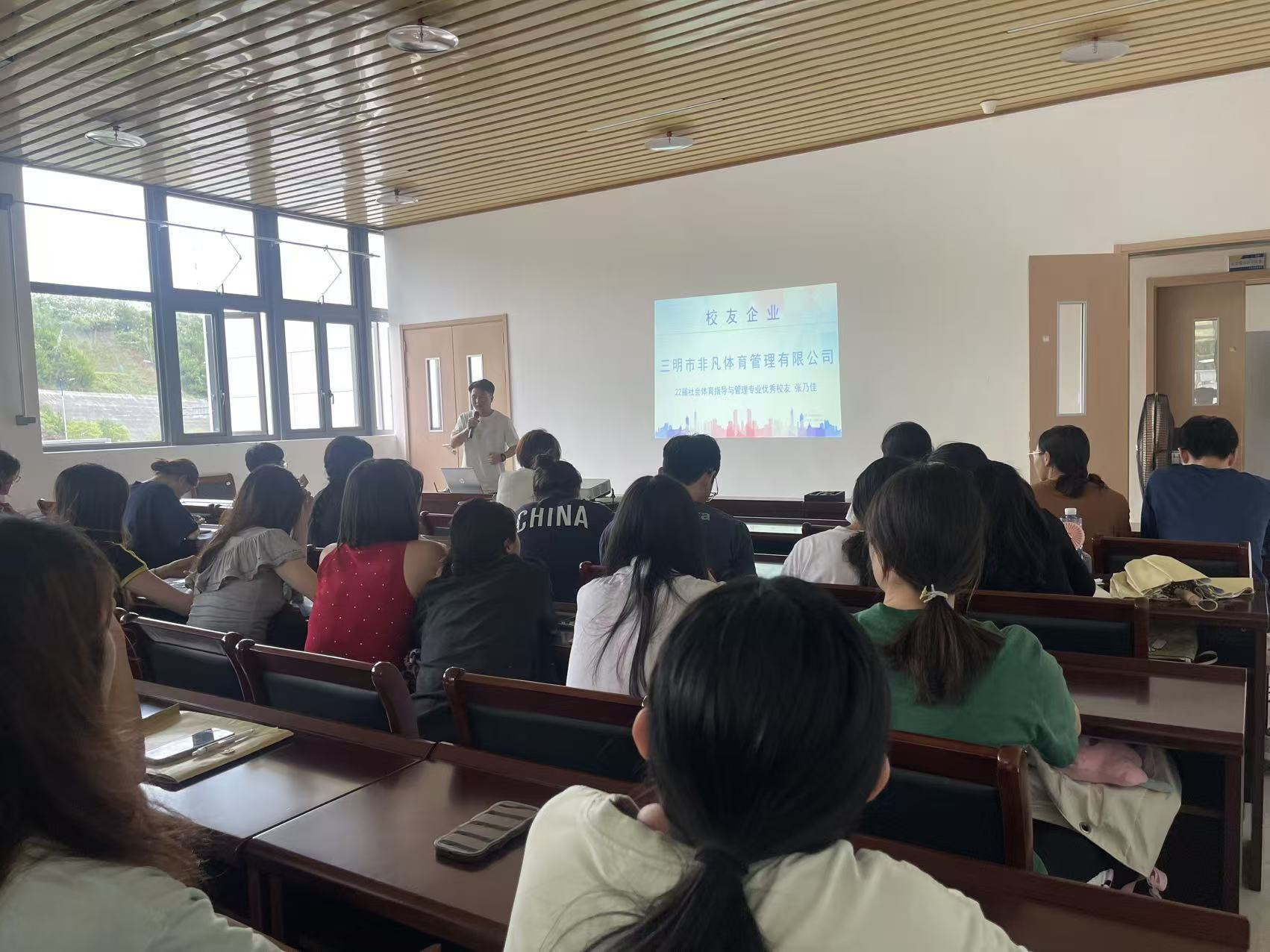 宣讲会现场,企业负责人、学院2018届毕业生张乃佳以“师兄”身份分享成长经历。他结合自身从体育专业学子到少儿体育教育创业者的发展历程,生动解读了少儿体育培训行业的发展前景与职业机遇,让在场学生倍感亲切与共鸣。