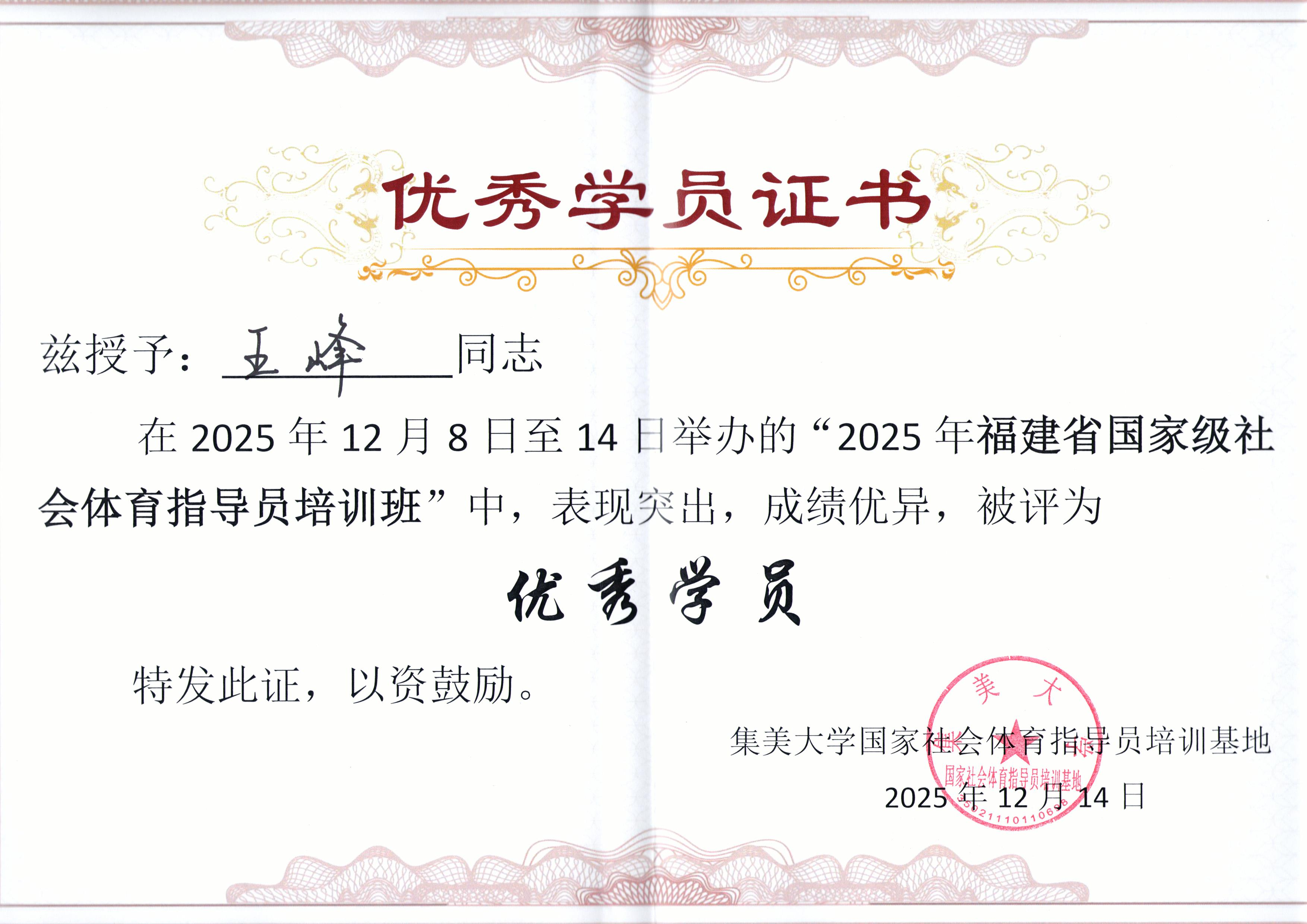 2025年12月8日-14日,由国家体育总局、福建省体育局、福建省社体中心和福建省社会体育指导员协会以及集美大学体育学院培训基地主办的2025年福建省国家级社会体育指导员培训班在厦门举行。此次培训共有来自全省70多名学员参加,我院教师王峰、徐新建两位老师经三明市体育局推荐参加了此次培训,经过7天的理论与实践学习,最终考核合格,通过国家级社会体育指导员的考核,王峰老师获评优秀学员称号。