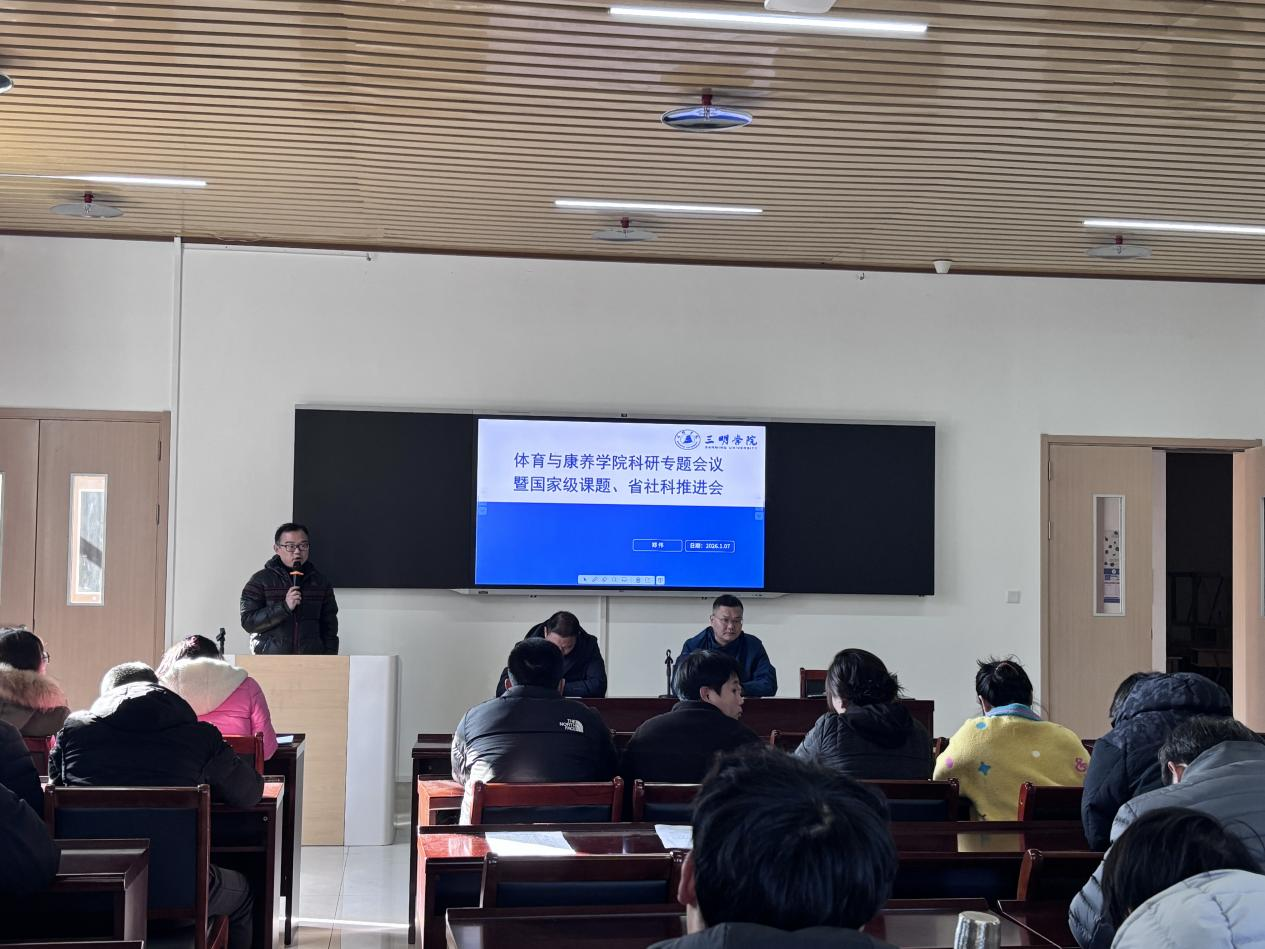 2026年1月7日下午,体育与康养学院在学院会议室隆重召开了科研专题会议暨国家级课题、省社科项目申报推进会。会议由学院分管科研工作的副院长郑伟主持并作专题报告,全员教职工参加会议。